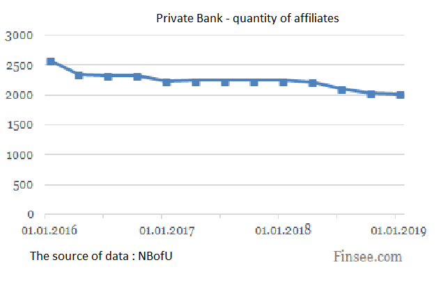 Fig.2 Number of affiliates of PrivatBank during 2016-2019 (The closed joint-stock company the commercial bank «PrivatBank») [4]